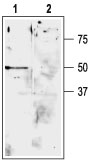 Western blot analysisof rat cerebellum lysate: 1. Anti-K 2P 9.1 (TASK-3) antibody (APR00496G),(1:200). 2. Anti- K 2P 9.1 (TASK-3) antibody, preincubated with the control peptide antigen. |
