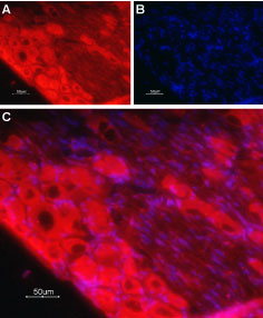 Expression of TrkC in rat dorsal root ganglia Immunohistochemical staining of rat dorsal root ganglia (DRG) frozen sections usingAnti-TrkC (extracellular)antibody (APR00499G), (1:100). A. TrkC labeling (red) appears in cell bodies. Note that the nerve fibers are not stained. B. Nuclear staining (blue) was visualized using Hoechst 33342. C. Merge of A and B.