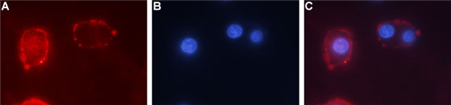 Expression of TrkC in live intact rat PC12 pheochromocytoma cells Immunocytochemical staining of live intact PC12 cells A. Extracellular staining of cells using Anti-TrkC (extracellular) antibody (APR00499G), (1:50) followed by goat anti-rabbit-AlexaFluor-594 secondary antibody (red). B. Nuclear staining using the cell permeable dye Hoechst 33342 (blue). C. Merge image of A and B. |