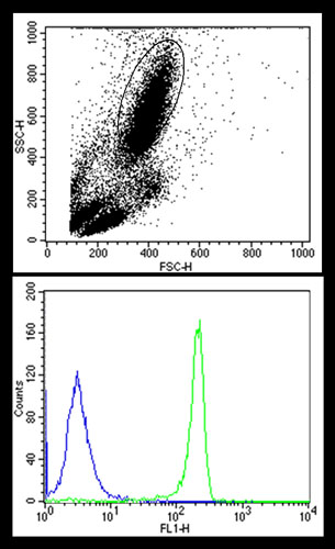 Flow cytometric analysis of human peripheral blood granulocytes cells using Anti-CXCR2 (extracellular) (green, APR00507G) compared to an isotype control of rabbit IgG (blue). APR00507G was diluted at 1:50 dilution. An Alexa Fluor 488-conjugated goat anti-rabbit lgG at 1:400 dilution was used as the secondary antibody.