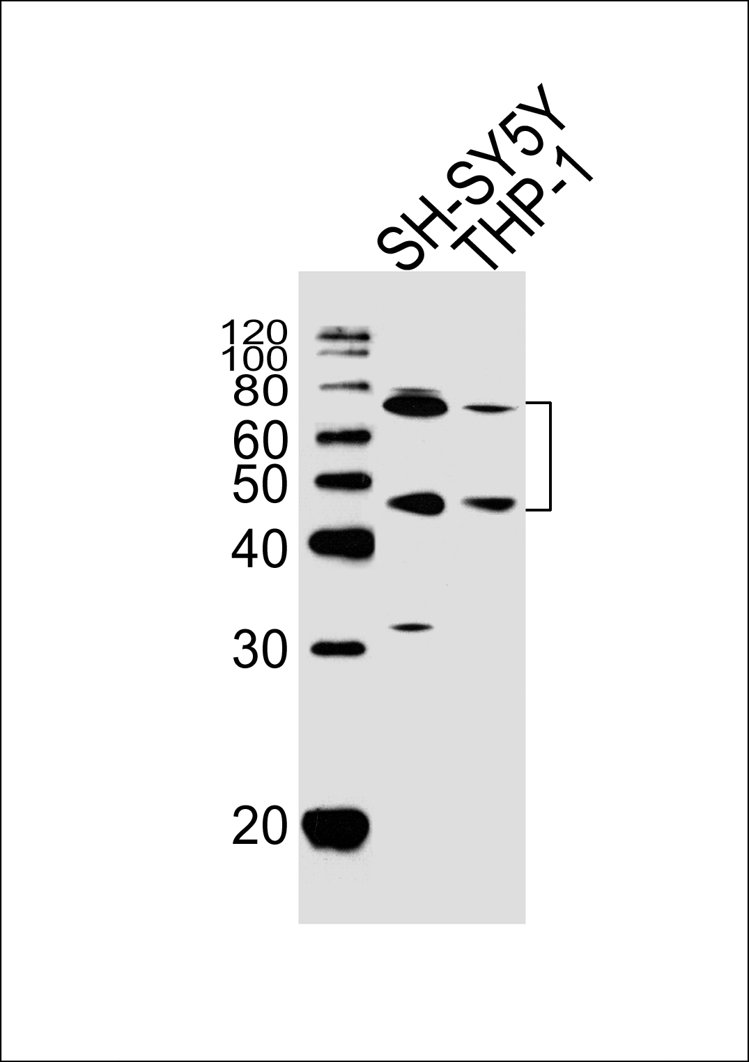 Western blot analysis of lysates from SH-SY5Y, THP-1 cell line (from left to right), using CXCR2 Antibody(APR00507G). APR00507G was diluted at 1:1000 at each lane. A goat anti-rabbit IgG H&L(HRP) at 1:5000 dilution was used as the secondary antibody. Lysates at 35ug per lane.