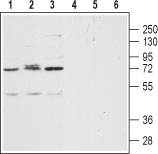 Western blot analysis of Jurkat (lanes 1 and 4), SH-SY5Y (lanes 2 and 5) and THP-1 (lanes 3 and 6) lysates: 1-3. Anti-CXCR2 (extracellular) antibody (APR00507G), (1:200). 4-6. Anti-CXCR2 (extracellular) antibody, preincubated with the control peptide antigen. |