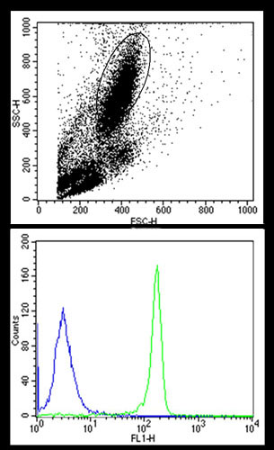 Chemokine receptors belong to the seven transmembrane domain G-Protein Coupled Receptors and are differentially expressed in diverse cell types. In leukocytes, chemokines coordinate development, differentiation, anatomic distribution, trafficking, and effector functions and thereby regulate innate and adaptive immune responses.To date, 18 chemokine receptors are known and designated as CXCR1-5, CCR1-11, XCR1, and CX3CR1 based on their specific chemokine preferences. The CXC chemokine receptors specifically bind and respond to cytokines of the CXC chemokine family. CXCR1 and CXCR2 were the first chemokine receptor subtypes to be defined. They are the only known mammalian receptors for ELR+ CXC chemokines [CXC chemokines which contain the tripeptide motif glutamic acid-leucine-arginine (ELR) N-terminal to the first cysteine]. CXCR1 and CXCR2 both bind IL-8, with similar high affinity; they do not bind other types of chemokines. CXCR1 and CXCR2 are the major chemokine receptors expressed on neutrophils. They appear to operate mainly in acute inflammation and innate immunity. Abgent is pleased to offer a highly specific antibody directed against an extracellular epitope of the human CXCR1. Anti-CXCR1 (extracellular) antibody (#AG1298) can be used for western blot analyses and indirect flow cytometry applications. It was specifically designed to recognize human CXCR1.