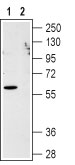 Western blot analysis of CXCR1 in Jurkat cell lysate: 1. Anti-CXCR1 (extracellular) antibody (APR00508G), (1:200). 2. Anti- CXCR1 (extracellular) antibody, preincubated with the control peptide antigen.