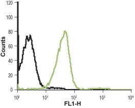 Indirect Flow cytometry analysis of Jurkat living cells: Black: Unstained cells. Green: Cells + Anti-CXCR1 (extracellular) antibody (APR00508G), (10 μg/5x105 cells). |
