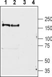 Western blot analysis of rat (lanes 1 and 3) and mouse (lanes 2 and 4) brain lysates: 1-2. Anti-BAI1 (extracellular) antibody (APR00510G), (1:200). 3-4. Anti-BAI1 (extracellular) antibody, preincubated with the control peptide antigen.