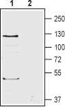 Western blot analysis of human HL-60 promyelocytic leukemia cell lysates: 1. Anti-BAI1 (extracellular) antibody (APR00510G), (1:200). 2. Anti-BAI1 (extracellular) antibody, preincubated with the control peptide antigen.