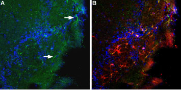 Expression of BAI1 in mouse olfactory bulb Immunohistochemical staining of mouse perfusion-fixed olfactory bulb frozen sections using Anti-BAI1 (extracellular) antibody (APR00510G), (1:200). A. BAI1 (green) is expressed in astrocyte-like cells (arrows). B. Double-staining of BAI1 (green) and glial fibrillary acidic protein (red) reveals expression of BAI1 in a subset of astrocytes. Nuclear staining of cells using the DNA dye DAPI (blue). |
