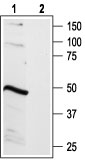 Western blot analysis of rat brain lysate: 1. Anti-B2 Bradykinin Receptor antibody (APR00511G), (1:1000). 2. Anti-B2 Bradykinin Receptor antibody, preincubated with the control peptide antigen.