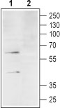 Western blot analysis of differentiated HL-60 cell lysate: 1. Anti-C3a Anaphylatoxin Receptor (extracellular) antibody (APR00512G), (1:200). 2. Anti-C3a Anaphylatoxin Receptor (extracellular) antibody, preincubated with the control peptide antigen.