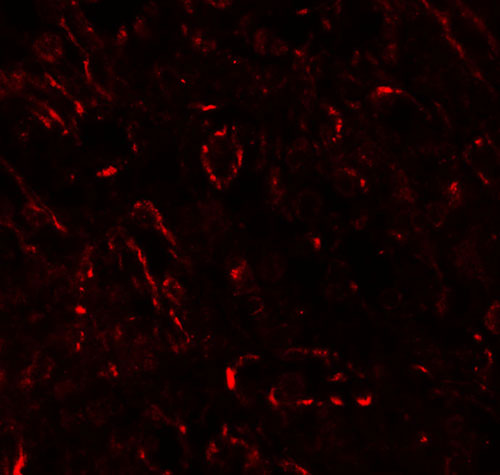 Immunofluorescence of TNFSF4 in human spleen tissue with TNFSF4 antibody at 20 μg/ml. |