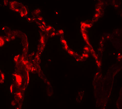Immunofluorescence of IL-12A in human kidney tissue with IL-12A antibody at 20 μg/mL. |