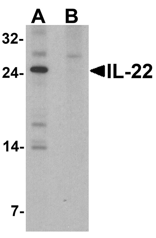 Western blot analysis of IL-22 in HeLa cell lysate with IL-22 antibody at 1 μg/ml in (A) the absence and (B) the presence of blocking peptide.