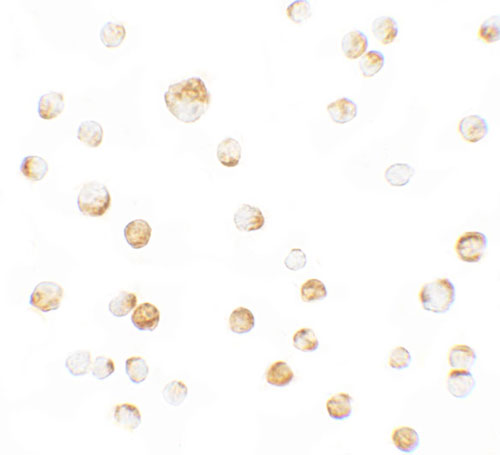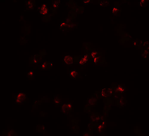 Immunofluorescence of IL-22 in HeLa cells with IL-22 antibody at 20 μg/mL. |