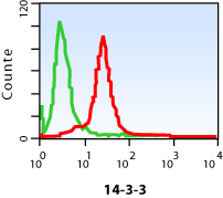 C. Flow cytometric analysis of permeabilized HeLa cells using anti-14-3-3 b/a RabMAb (red) (Cat. APR13980G) or a rabbit IgG (negative) (green). |