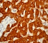 B. Immunohistochemical staining of paraffin-embedded human liver using anti-ACAT RabMAb (Cat. APG01440G). |