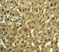 B. Immunohistochemical analysis of paraffin-embedded human liver using anti-AcetylCoenzyme A RabMAb (Cat. APG01483G). |
