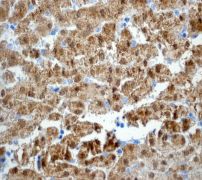 Immunohistochemical analysis of paraffin-embedded human liver tissue using anti-ADH6 RabMAb (Cat. APG01569G). |