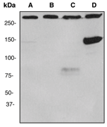 B. Western blot analysis on (A) TF-1, (B) SH-SY5Y, (C) HeLa and (D) human brain lysates using anti-alpha Fodrin RabMAb (Cat. APR14916G), dilution 1:2000. |
