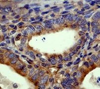 B. Immunohistochemical analysis of paraffin-embedded human gastric carcinoma using anti- alpha-Tubulin RabMAb (Cat. APR11255G).