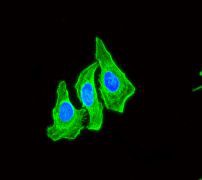 Immunofluorescent staining of HeLa cells using Phospho-specific anti-AMPK RabMAb (Cat. APG01840G). |