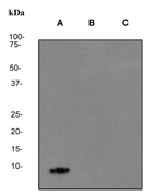 A. Western blot analysis on 5ng of recombinant protein using anti-APP (A beta 40) RabMAb (Cat. APR11403G), dilution 1:500.