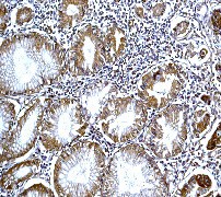 B. Immunohistochemical analysis of paraffin-embedded stomach adenocarcinoma using anti-Apaf-1 RabMAb (Cat. APG01899G). |