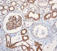 B.Immunohistochemical analysis of paraffin-embedded human kidney using anti-Calpain 1 (small subunit) RabMAb (Cat. APG02338G). |