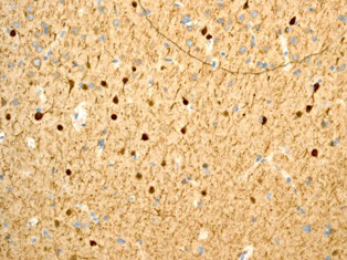 Immunonohistochemical analysis of paraffin-embedded human brain tissue using anti-Calretinin RabMAb (Cat. APR11546G).