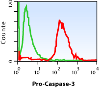 C. Flow cytometric analysis of permeabilized Jurkat cells using anti-Pro-Caspase-3 RabMAb (red) (Cat. APG02400G) or a rabbit IgG (negative) (green). |