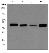 A. Western blot analysis on (A) TF-1 (B) HeLa (C) Jurkat (D) HepG2 cell lysates using anti-Catalase RabMAb (Cat. APG02434G), dilution 1:1000. |