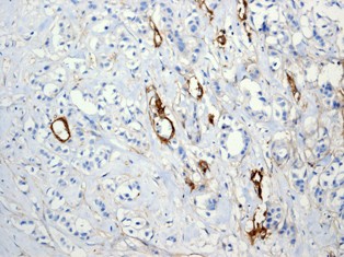 Immunohistochemical analysis of paraffin-embedded human breast carcinoma using anti-CD90 RabMAb (Cat. AMM05723G).