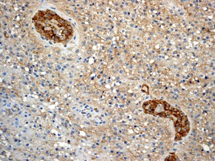 Immunohistochemical analysis of paraffin-embedded human glioma using anti-CD90 RabMAb (Cat. AMM05724G).