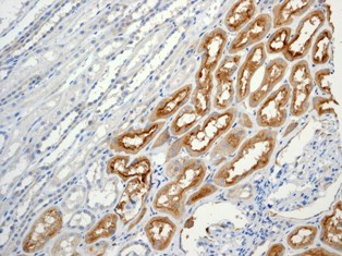 Immunohistochemical analysis of paraffin-embedded human normal kidney tissue using anti-CD90 RabMAb (Cat. AMM05724G). |