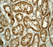 B. Immunohistochemical staining of paraffin-embedded human kidney using anti-Cytochrome C RabMAb (Cat. APR07478G). |
