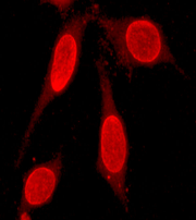 Fig 2. Immunofluorescent staining of HeLa cells using anti-ER beta RabMAb (Cat. AMM04427G) |