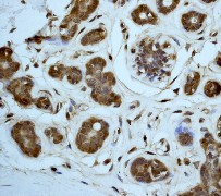 B. Immunohistochemical analysis of paraffin-embedded human breast carcinoma using anti- ERK2 p42 MAPK (C-term) RabMAb (Cat. APR08322G). |