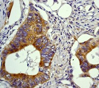 B. Immunohistochemical analysis of paraffin-embedded human colon carcinome using anti- GSK-3? (C-term) RabMAb (Cat. AMM05219G). |