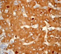 B. Immunohistochemical staining of paraffin-embedded human liver using anti-HO-1 RabMAb (Cat. AMM05329G).