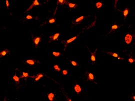B. Immunofluirescent staining of HeLa cells using anti-HNRPUL1 RabMAb (Cat. AMM05387G)