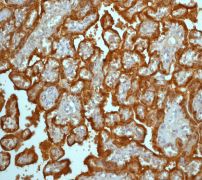 B. Immunohistochemical staining of paraffin-embedded human placenta using anti-HSD17B1 RabMAb (Cat. APR07804G). |