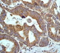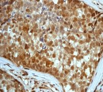 B. Immunohistochemical analysis of paraffin-embedded human breast carcinoma using Phospho-specific anti-HSF1 RabMAb. |