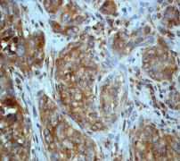 B. Immunohistochemical staining of paraffin-embedded human breast carcinoma using anti-JNK2 RabMAb (Cat. APR08056G). |