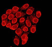 B. Immunofluorescent staining of HeLa cells using anti-LBR RabMAb (Cat. APR08116G). |