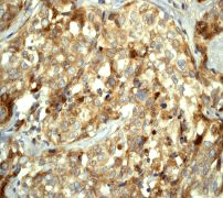 B. Immunohistochemical staining of paraffin-embedded human breast carcinoma using anti-MAPILC3A RabMAb (Cat. APR08344G). |