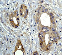 B. Immunohistochemical analysis of paraffin-embedded human ovary adenocarcinoma using anti-MEKK4 RabMAb (Cat. AMM06369G). |