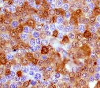 B. Immunohistochemical analysis of paraffin-embedded human lymphoma using anti-MerTK RabMAb (Cat. AMM06378G). |