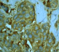 B. Immunohistochemical staining of paraffin-embedded human breast carcinoma using anti-MMP-14 RabMAb (Cat. APR08480G). |