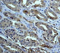 B. Immunohistochemical analysis of paraffin-embedded human prostate carcinoma using anti-mTOR/FRAP RabMAb (Cat. APR08569G). |