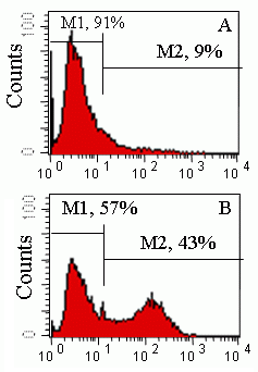 B. Flow cytometric analysis of apoptotic and non-apoptotic Jurkat cells using anti-cleaved PARP-1 RabMAb (Cat. APR08933G). Jurkat cells were either left untreated (A) or treated with camptothecin (4 uM, 5 hr) to induce apoptosis (B). Cells were fixed and permeabilized, and then stained with anti-cleaved PARP-1. The results indicate that 43% of cells were positive for cleaved PARP (B, M2) after treatment, compared to 9% positive without treatment (A, M2). |